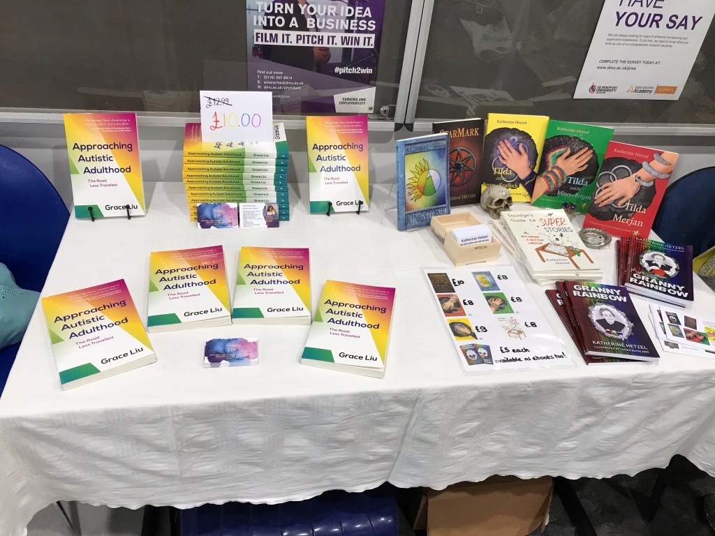 On Saturday 26th March, I sold copies of my book at States of Independence 2022 at De Montfort University (my old uni) in Leicester. I shared a table with a good friend of mine, Katherine Hetzel, who is an author for children and young people (her website is here). The event took place from 10am-4.:30pm, and involved bookselling stalls (such as mine!), talks, discussions, workshops and book launches. There were students selling publications they had created as part of their course – something I did myself, back in the day – and various independent authors selling all kinds of books. There were children’s books, fiction, non-fiction, poetry and even art. It was nice to catch up with some of my old lecturers, and I had some really great conversations with other passers-by, many of whom had some connection to autism. By the end of the day, I sold 7 books. It was a great day, and I look forward to doing it again!