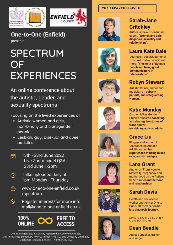 On Monday 13th June 2022 at 2pm, I did a live talk on Zoom for One-to-One, an autism charity in Enfield! This was part of an online conference focusing on the lived experiences of autistic women and LGBT+ people. I shared my story about growing up biracial, autistic and a lesbian. To find out more, please visit http://www.one-to-one-enfield.co.uk/spectrum or contact mail@one-to-one-enfield.co.uk.