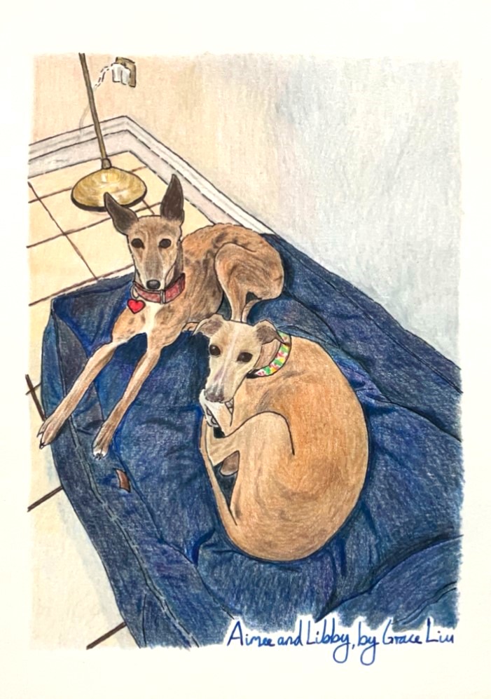Meet Aimee and Libby, two Greyhounds who were rescued from the meat trade. They bonded with each other at the rescue centre and so had to be rehomed together. They are now living their best life and are very clever and full of energy. I’m told it was a struggle to get a photo of them both sitting still!
