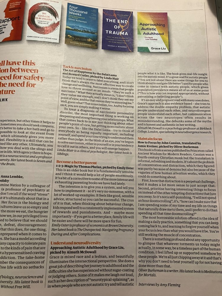My book, Approaching Autistic Adulthood: The Road Less Travelled, has been reviewed in the Guardian! As a result, it has gone from being in the top 20,000/30,000 on Amazon to being 644th – a record for me! Thank you to Almuth McDowall for reviewing it, and to anyone who has ever bought it, read it or reviewed it. If you haven’t done so, any purchases or Amazon reviews will keep those numbers rising! Meanwhile, please click here for the review, or have a look at the printed version below. For more musings and anecdotes on autism, LGBT+ issues and general life, don’t forget to follow my blog: Unwritten Grace writing. Please also feel free to stay in touch via Facebook, Instagram and LinkedIn.